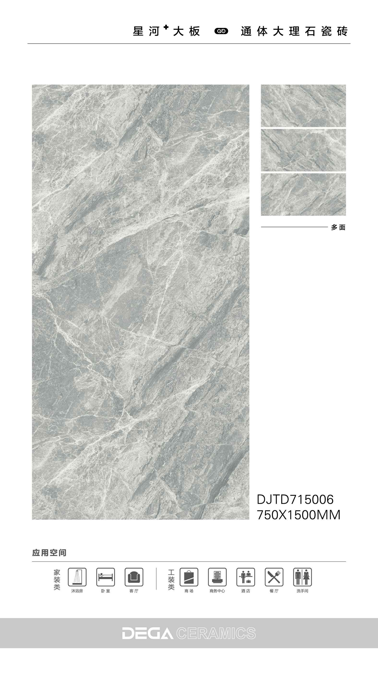 从规格形式的选择、纹理的趣味,到丰富内涵的表现、文化的传承等…… 都是她的每一侧面,在750X1500MM创造的舞台中央,是属于一片瓷砖传奇剧的演出。